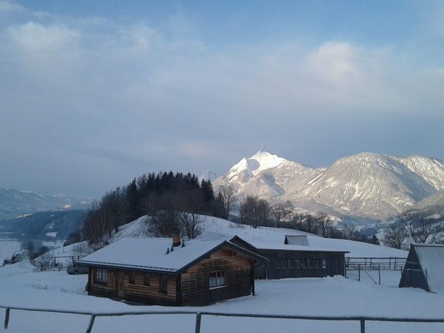 "surrounding_area": "In Alleinlage liegt die Almhütte, am Fuße des Gritschenberges, auf einem sonnigen Hochplateau, mit fantastischer Aussicht auf den Hausberg Grimming und in das obere Ennstal. Hinter der Almhütte können Sie gerne unsere zahmen Strauße besuchen. Bis zu 3m hoch werden die größten Vögel der Erde. Sie fühlen sich in unseren klimatischen Verhältnissen im Sommer sowie im Winter sehr wohl. Jausenstation 2,5km, Niederöblarn 2,5km, Skigebiet Galsterberg 19km. Einfach ideal liegt die Almhütte: die Skischaukel Hauser Kaibling – Planai – Hochwurzen (ski amadé) ist 25km entfernt und bequem über asphaltierte, geräumte Straße mit PKW in 20 min erreichbar. Tauplitzalm 16km und in 15min erreichbar, Donnersbachwald 25km. Grimming Therme Bad Mitterndorf 23km. Golf 8km. Putterer See 12km. Von der Almhütte aus, herrliche Wanderungen oder Biketouren ins Ennstal oder die schönen Seitentäler mit ihren unzähligen Wanderrouten und bewirtschafteten Almen.",